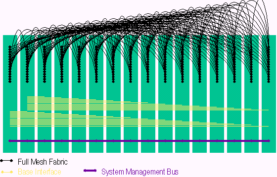 PICMG 3.0包含多種傳輸,這些傳輸模式如圖由下而上依序提供系統(tǒng)管理層、控制層、資料層等的聯(lián)接。系統(tǒng)管理是基于一條與各槽位都相連的I2C 雙串行信號線, 系統(tǒng)管理信息則是基于IPMI規(guī)范被擴(kuò)展到在PICMG3.0規(guī)范中使用。系統(tǒng)管理總線也是冗余方式確保在一條總線故障情況下,管理信息仍正常傳遞。在資料層旁邊的控制層稱作Base 接口 (Base Interface),Base接口是一個雙星型的拓?fù)浣Y(jié)構(gòu)具有冗余的交換刀片和以太網(wǎng)BAST-T信號,在PICMG 3.0中提供IP傳輸,這點在架構(gòu)定義上非常像PICMG 2.16。PICMG 3.0單板的高速數(shù)據(jù)傳輸是通過Fabric接口 (Fabric Interface),F(xiàn)abric接口是基于3.125Gbps SERDES信號,可以在星型和全網(wǎng)狀結(jié)構(gòu)中支持10Gb的傳輸速率。正如上面提到的,PICMG 3.0核心規(guī)范定義了Fabric接口的信號和互聯(lián),而輔助規(guī)范定義了用于傳輸?shù)膮f(xié)議。PICMG 3.0 背板的互聯(lián)支持全網(wǎng)狀Fabric接口,雙星型Base接口和冗余的系統(tǒng)管理,如下圖所示: