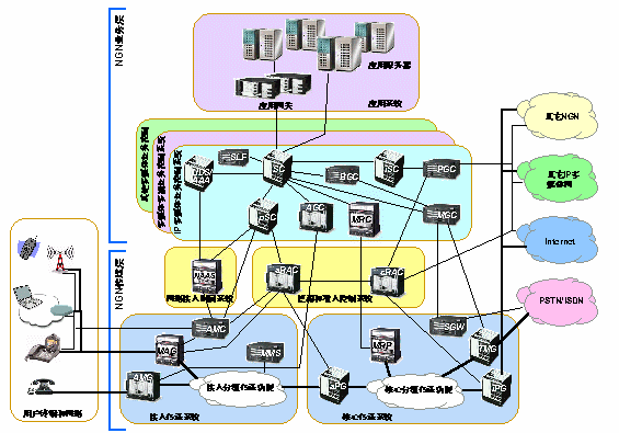 NGN網(wǎng)絡(luò)邏輯上可分為用戶網(wǎng)、接入網(wǎng)和核心網(wǎng)。網(wǎng)絡(luò)的管理界限將NGN劃分為一些不同的NGN域。接入網(wǎng)和核心網(wǎng)可在同一NGN域中,也可以屬于不同的域。域內(nèi)的網(wǎng)絡(luò)拓撲信息可以對外屏蔽。域和域之間的互通將通過網(wǎng)關(guān)來完成。NGN支持與現(xiàn)有的網(wǎng)絡(luò)互通,如電話網(wǎng)絡(luò)、蜂窩網(wǎng)絡(luò)、互聯(lián)網(wǎng)等。NGN還支持各種有"NGN意識"的用戶設(shè)備和現(xiàn)有的無"NGN意識"的終端,如模擬電話機、傳真機、ISDN終端等。這些互通都通過網(wǎng)關(guān)來完成。NGN的網(wǎng)關(guān)主要包括多媒體接入網(wǎng)關(guān)、接入媒體網(wǎng)關(guān)、中繼媒體網(wǎng)關(guān)、分組網(wǎng)關(guān)和信令網(wǎng)關(guān)。