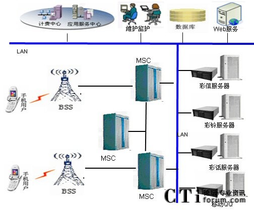 下圖是研祥智能科技股份有限公司采用CompactPCI計算機硬件平臺提供的電信增值業(yè)務(wù)解決方案從方框圖:電信用戶通過交換中心(MSC)向各個服務(wù)器(彩信、彩鈴、彩話、移動QQ)提取信息,服務(wù)器由研祥CPCI產(chǎn)品構(gòu)成。主控業(yè)務(wù)邏輯運行的功能實體,管理和控制平臺業(yè)務(wù)的運行、對業(yè)務(wù)腳本進行管理并對業(yè)務(wù)進行監(jiān)控和統(tǒng)計,同時計費中心向用戶計費。