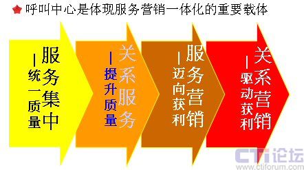 呼叫中心是體現(xiàn)服務營銷一體化的重要載體。我在前面已經(jīng)說了,服務和營銷一個是被動一個是主動,一個inbound一個outbound,呼叫中心可以非常完整地將兩者融合到一起,它是一個非常重要的服務營銷的載體。我們從呼叫中心整個營銷策略的進程當中,可以看到非常明顯的四個階段: