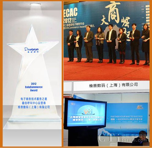 CTI論壇(ctiforum)3月30日消息(記者 浩宇):2012年3月27-28日,“2012第三屆易觀EnfoCommerce Award電子商務年會暨頒獎典禮”在北京海航萬豪酒店隆重舉行,超過3000名實名認證聽眾、100余家傳統(tǒng)企業(yè)和電商企業(yè)的行業(yè)精英參加了本次年會,維音作為電子商務呼叫中心領(lǐng)域的專家也受邀參加了此次盛會。