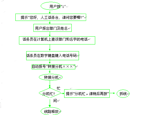 話務(wù)員不需要說話, 系統(tǒng)在所有必要之處都有提示音, 話務(wù)員只要在數(shù)字鍵盤上鍵入部門號"0××"和電話號碼"2××"。