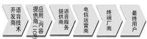 語音互聯(lián)網將最終形成由語音技術開發(fā)商-應用/內容提供商-語音服務提供商-電信運營商-終端廠商組成的產業(yè)價值鏈(見圖2)。