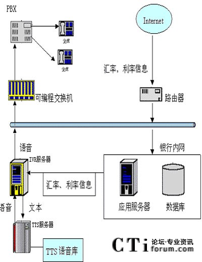 銀行可從網(wǎng)上下載匯率信息或利率信息,之后將這些信息的文本傳遞給IVR服務(wù)器,IVR會通過調(diào)用TTS服務(wù)器得到這些信息的語音流,之后就可以在坐席上播放這些匯率或利率的語音了。