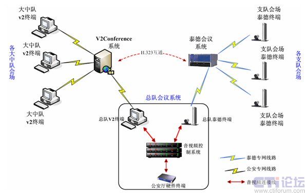 根據(jù)整目前廣東省消防部隊(duì)網(wǎng)絡(luò)整體部署在全省公安網(wǎng)絡(luò)基礎(chǔ)之上,已經(jīng)全部接入公安網(wǎng)絡(luò),所以V2 Conference系統(tǒng)也構(gòu)建在這個(gè)網(wǎng)絡(luò)平臺(tái)之上,如下所示:
