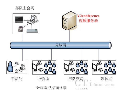 V2視頻會(huì)議系統(tǒng)建立在森警部隊(duì)專網(wǎng)的基礎(chǔ)上,各區(qū)作戰(zhàn)部隊(duì)會(huì)議室、指揮室和部隊(duì)營(yíng)房會(huì)議均為光纖100M接入,每個(gè)中隊(duì)官兵營(yíng)房都集中建立了培訓(xùn)會(huì)議室,負(fù)責(zé)日常新兵的培訓(xùn)教育。在現(xiàn)有的網(wǎng)絡(luò)基礎(chǔ)上構(gòu)建了V2視頻會(huì)議系統(tǒng),來(lái)滿足各個(gè)中隊(duì)和教導(dǎo)大隊(duì)的網(wǎng)絡(luò)會(huì)議和培訓(xùn)需求。在每個(gè)節(jié)點(diǎn)會(huì)議室部署了電視、攝像頭和相關(guān)音響設(shè)備,目前已經(jīng)建成10多個(gè)網(wǎng)絡(luò)會(huì)議節(jié)點(diǎn)的遠(yuǎn)程視頻培訓(xùn)系統(tǒng)。