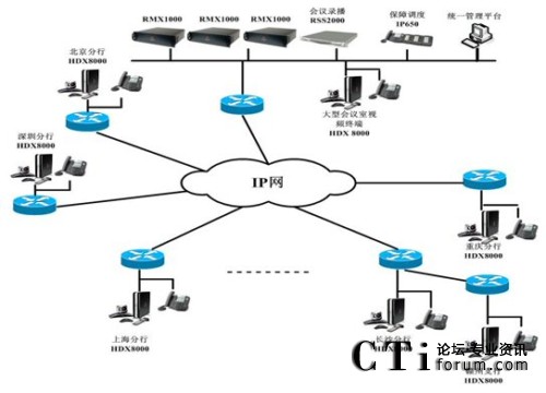 RMX1000作為多媒體多點處理單元,70臺HDX8006和HDX8002分布在全國各個分行作為視頻會議的接入,RSS2000服務(wù)器提供HD的會議錄制;65臺IP電話作為實時會議備份系統(tǒng);整個系統(tǒng)提供720P/60幀或1080P/30幀的會議畫面質(zhì)量,音頻達到22KHz寬帶音質(zhì),劇院級音質(zhì)享受,具備新一代高清雙流P