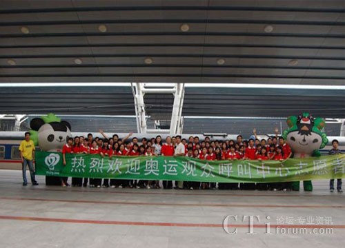 經(jīng)過23 個小時的車旅生活,我們來到了我們偉大的首都--北京.激動,意外,驚喜.我從來沒有想過會有福娃來接我們.當我們所有人看到晶晶和貝貝時候.23 個小時的勞累一掃而空.在奧組委的工作人員的帶領(lǐng)下.我們在一號站臺集合.終于可以滿足大家的心愿拉!!-和福娃合影咯!看看大家多有激情!那2個福娃是大家精神的強大的動力.哈哈.和我們親愛的奧運吉祥物合影留念后.大家坐上涼爽的冷巴.向我們的駐地開進!