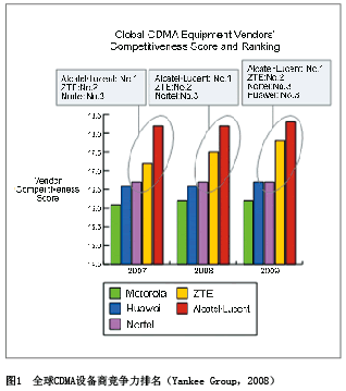 All-IP上的領(lǐng)先地位的進(jìn)一步鞏固,中興通訊已經(jīng)成為全球CDMA的領(lǐng)導(dǎo)者, Yankee group 2008年的一份咨詢報(bào)告顯示,中興通訊CDMA綜合排名穩(wěn)居全球第一集團(tuán)行列(見圖1)。