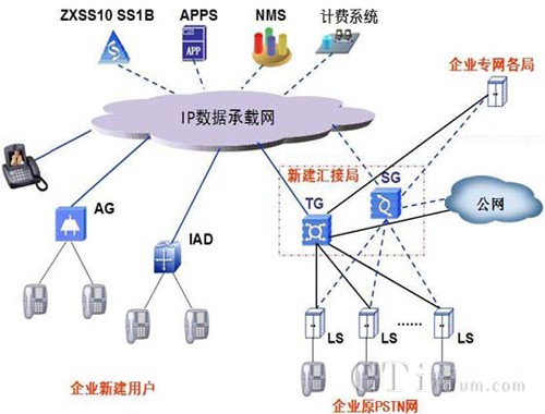 在A城市大企業(yè)總部,將原有的端局通過(guò)E1接口連接到TG/SG,在軟交換控制設(shè)備的控制下,實(shí)現(xiàn)企業(yè)原有電話和企業(yè)內(nèi)部跨域的各分支之間的VoIP語(yǔ)音長(zhǎng)途業(yè)務(wù)。同時(shí)通過(guò)在TG進(jìn)行路由配置,實(shí)現(xiàn)了企業(yè)軟交換網(wǎng)絡(luò)各IP語(yǔ)音終端與A城市PSTN的互通,實(shí)現(xiàn)企業(yè)各地到A城市PSTN網(wǎng)的來(lái)話落地。