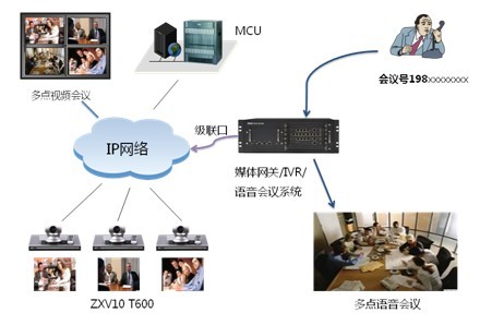 在現(xiàn)有視頻會議網(wǎng)絡基礎上新增語音網(wǎng)關設備,主要負責PSTN、移動網(wǎng)和IP網(wǎng)絡的信令轉接、音頻編碼的轉換、多點純語音會議、IVR會議引導。