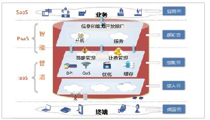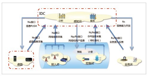 中興通訊增強端到端信息感知和開放接口,提出一套標(biāo)準(zhǔn)架構(gòu)如圖2所示,來實現(xiàn)整個網(wǎng)絡(luò)透明、可視。建設(shè)網(wǎng)絡(luò)信息采集體系,增強感知云的端到端分析能力;建立“桌面云-感知云”的云端一體化架構(gòu),提供網(wǎng)絡(luò)推送能力;感知云向終端開放網(wǎng)絡(luò)信息和能力,增強用戶感知網(wǎng)絡(luò)、定制個人體驗?zāi)芰;感知云向業(yè)務(wù)開放網(wǎng)絡(luò)信息和能力,拓展合作發(fā)展增值業(yè)務(wù)的能力。
