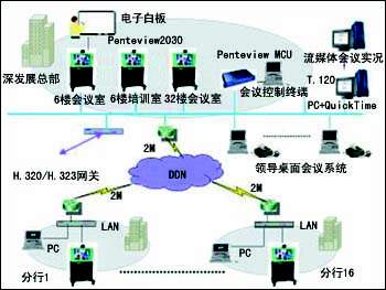 中太數(shù)據(jù)為深圳發(fā)展銀行構建的視頻會議項目,是為深圳發(fā)展銀行在已有的DDN網(wǎng)絡的基礎上,構建的一個全國性的會議電視平臺。通過這個平臺,使跨地域的溝通更加經濟、高效和靈活。針對深發(fā)展的網(wǎng)絡實際情況以及會議電視的發(fā)展方向,方案中采用基于MPEG-4的Penteview2030產品,支持H.323的MCU Penteview 6182,以及Penteview數(shù)據(jù)會議服務器。整個深發(fā)展會議電視系統(tǒng)組網(wǎng)分為兩級,中心點3套Penteview 2030到下面的16個異地的分支行。深圳發(fā)展銀行大廈6樓大會議室、培訓小會議室、32樓會議室作為主會議室,在6樓的機房中放置主MCU和一個終端,培訓小會議室放置一個終端,其他16個異地分支行分別放置一臺Penteview2030終端,通過現(xiàn)有的深發(fā)展DDN網(wǎng)絡相互連通。根據(jù)深發(fā)展通信網(wǎng)絡結構及傳輸容量的實際情況,該系統(tǒng)采用星型拓撲連接,各地可通過現(xiàn)有的DDN劃出768k-2M的帶寬,以視頻會議的方式組建起多點會議電視系統(tǒng)。各會場通過PC機實現(xiàn)數(shù)據(jù)會議功能。
