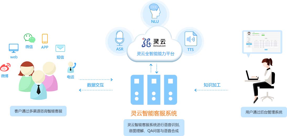 客戶通過電話、微信、網(wǎng)頁等多種渠道咨詢智能客服,靈云全智能客服系統(tǒng)進(jìn)行語音識別、意圖理解、QA問答與語音合成,企業(yè)通過后臺(tái)管理智能客服系統(tǒng)。