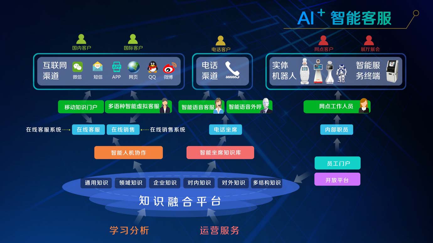 多種渠道融合:覆蓋網(wǎng)頁、微信、短信、APP、實(shí)體機(jī)器人等多種客服渠道,通過文本、語音、圖像等不同展現(xiàn)方式,充分利用互聯(lián)網(wǎng)和移動(dòng)設(shè)備,與用戶之間進(jìn)行溝通交互