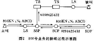 --用戶在撥打800號(hào)業(yè)務(wù)用戶號(hào)碼時(shí),首先由網(wǎng)絡(luò)點(diǎn)上的普通電話交換機(jī)接收,并把800KN1N2ABCD號(hào)碼經(jīng)話路傳送給業(yè)務(wù)交換點(diǎn)SSP,再由SSP將此號(hào)碼經(jīng)No.7信令鏈路送到業(yè)務(wù)控制點(diǎn)SCP,SCP通過在業(yè)務(wù)數(shù)據(jù)庫SDP中查尋譯碼表將此號(hào)碼翻譯成普通的電話號(hào)碼回送SSP,最后由SSP負(fù)責(zé)完成電路的連接,該過程如圖2所示。