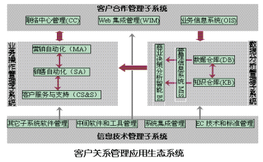 根據(jù)目前IT產(chǎn)業(yè)領域和管理界對CRM的開發(fā)、討論及應用的經(jīng)驗和反饋,綜合來講,一個完整的客戶關(guān)系管理應用系統(tǒng)由如下四大生態(tài)子系統(tǒng)組成: