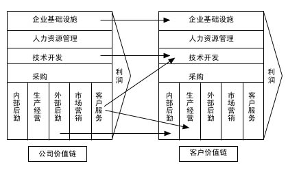 企業(yè)的主要活動都是具有相應價值的,這些活動構成了企業(yè)的價值鏈,企業(yè)價值鏈首先表現(xiàn)為企業(yè)內部的聯(lián)系和支撐,各種活動相互配合,才能產(chǎn)生價值和利潤;其次,企業(yè)的活動和上游供貨商和下游用戶緊密聯(lián)系,相互影響。顯然,供貨商、用戶的各種活動方式能夠直接或者間接地影響企業(yè)的成本、利潤和競爭優(yōu)勢,同樣,企業(yè)的各種活動也將對它們產(chǎn)生很大的影響。