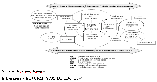 在 GartnerGroup 的一個名為“如何制定一個可操作的、有效的電子商務戰(zhàn)略”的報告中描述了電子商務(E-Business)的所有基本要素,他們是商業(yè)智能(BI),客戶關系管理(CRM),供應鏈管理(SCM),知識管理(KM), 協(xié)同技術(CT) 和E-Commerce。這些要素將成為新的一輪電子商務浪潮的特征。一些公司如 Dell, IBM,已經(jīng)成為這一輪變革中成功的代表。