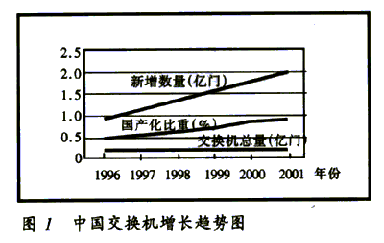 2000年,中國(guó)公用通信網(wǎng)上局用程控交換機(jī)的總?cè)萘窟_(dá)到1.79億門,國(guó)內(nèi)生產(chǎn)設(shè)備的比重達(dá)80%。預(yù)計(jì)2001年新增交換機(jī)容量2100萬(wàn)門,總?cè)萘窟_(dá)到2億門,國(guó)內(nèi)生產(chǎn)設(shè)備的比重超過(guò)85%,增長(zhǎng)趨勢(shì)見(jiàn)圖1。