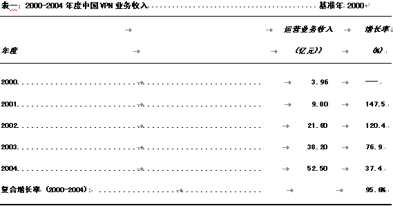 2000年,中國VPN運營業(yè)務(wù)收入為人民幣3.96億元,主要業(yè)務(wù)提供商為新興的電信運營商如網(wǎng)通、吉通、聯(lián)通等公司,以及數(shù)量可觀的或明或暗的網(wǎng)絡(luò)公司,VPN用戶主要集中在規(guī)模較大的外企、金融領(lǐng)域以及與IT相關(guān)的企業(yè)之中。隨著更多的虛擬運營商進(jìn)入VPN服務(wù)市場,以及企業(yè)成本意識的不斷增強,VPN用戶群體已經(jīng)呈擴散之勢,制造業(yè)、FMCG連鎖經(jīng)營業(yè)、酒店業(yè)等已經(jīng)迅速進(jìn)入這一市場。預(yù)計到2004年度,國內(nèi)VPN業(yè)務(wù)收入可以達(dá)到52.5億元人民幣,年復(fù)合增長率為95.6%。各年度測算數(shù)據(jù)見表一。