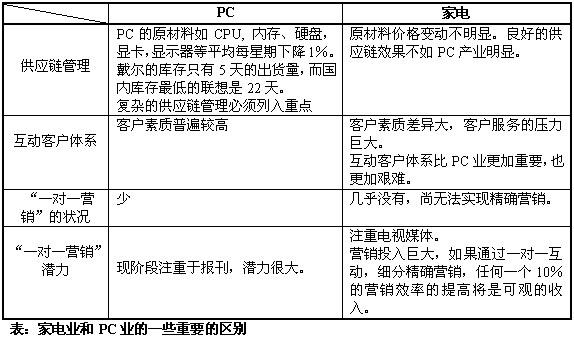 聯(lián)想長(zhǎng)期構(gòu)筑的、在中國(guó)PC制造業(yè)的核心競(jìng)爭(zhēng)力,正受到戴爾的巨大威脅,導(dǎo)致聯(lián)想開(kāi)始轉(zhuǎn)而采用戴爾的按客戶(hù)需求定制、直接銷(xiāo)售的模式,希望建立新的核心競(jìng)爭(zhēng)力,再度引領(lǐng)中國(guó)PC產(chǎn)業(yè)。IT制造業(yè)的巨變,戴爾的成功給陷于低層次競(jìng)爭(zhēng)的家電產(chǎn)業(yè)很大的啟發(fā),曾經(jīng)鑄造中國(guó)家電企業(yè)輝煌的核心競(jìng)爭(zhēng)力急需注入新的生命力,以適應(yīng)新的競(jìng)爭(zhēng)形勢(shì)。計(jì)算機(jī)技術(shù)、互動(dòng)通信技術(shù)的進(jìn)步以及互聯(lián)網(wǎng)的出現(xiàn)使企業(yè)能夠建立與用戶(hù)之間一對(duì)一的密切客戶(hù)關(guān)系,使服務(wù)創(chuàng)造價(jià)值,IT技術(shù)推動(dòng)技術(shù)、產(chǎn)品、生產(chǎn)、銷(xiāo)售和營(yíng)銷(xiāo)的發(fā)展,支撐家電企業(yè)建立新的核心競(jìng)爭(zhēng)力。在同質(zhì)化競(jìng)爭(zhēng)的環(huán)境下,家電企業(yè)也許更應(yīng)該從服務(wù)、營(yíng)銷(xiāo)、銷(xiāo)售方面來(lái)建立自己的核心競(jìng)爭(zhēng)力。海爾就是典型的例子,海爾的發(fā)展與它完善的服務(wù)體系和服務(wù)制度是分不開(kāi)的。聚焦于服務(wù)、營(yíng)銷(xiāo)、銷(xiāo)售的客戶(hù)關(guān)系管理(CRM)系統(tǒng)讓家電企業(yè)看到了新的希望?梢灶A(yù)言,CRM將為家電業(yè)點(diǎn)燃一盞新啟航燈。