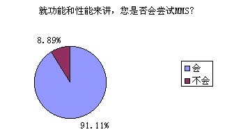 題8的調(diào)查結(jié)果對(duì)于中國移動(dòng)來講絕對(duì)是充滿誘惑的,高達(dá)91.11%的被訪者表示他們非常愿意嘗試MMS的功能和服務(wù),無疑這對(duì)ICP們(MMS服務(wù)的重要載體)也是一針強(qiáng)心劑啊!