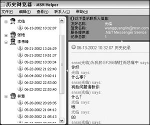 MSN Helper啟動(dòng)時(shí)會(huì)自動(dòng)啟動(dòng)MSN,可以看到在MSN的菜單欄上多了一個(gè)“助手”菜單。在這里“打開歷史瀏覽器”,就可以輕松地查看聊天記錄啦(如圖1)。如果覺得某些聊天的內(nèi)容比較重要,在右邊的記錄窗口里拖選中這些記錄,然后單擊“文件”菜單,將聊天記錄保存或打印出來(lái)。