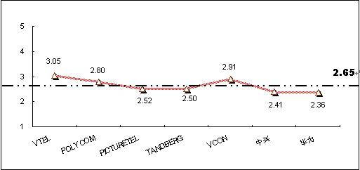 為深入了解和對(duì)比被調(diào)查者對(duì)不同品牌視頻會(huì)議終端系統(tǒng)產(chǎn)品的認(rèn)知程度,本次調(diào)查將被調(diào)查者對(duì)各主要品牌的了解程度劃分為五個(gè)檔次,對(duì)不同的檔次賦予不同的分值,分別為“非常了解(5分)”、“了解(4分)”、“一般(3分)”、“不了解(2分)”、 “非常不了解(0分)”,同時(shí)綜合考慮以購(gòu)買用戶擁有的品牌分布,借以比較不同品牌在認(rèn)知度上的差異。統(tǒng)計(jì)結(jié)果顯示,目前在中國(guó)市場(chǎng)上,用戶對(duì)主要視頻會(huì)議終端系統(tǒng)產(chǎn)品品牌的了解程度的平均值為2.65,各品牌認(rèn)知度分值見(jiàn)圖6。其中:VTEL品牌的知名度最高,指標(biāo)值為3.05,超過(guò)了“一般”了解水平;其次為VCON品牌,指標(biāo)值為2.91;POLYCOM的知名度指標(biāo)值為2.8,處于第三位。除VTEL品牌外,其他主要品牌的知名度還都處于低于“一般”了解水平階段,反映出產(chǎn)品的市場(chǎng)認(rèn)知還較低。
