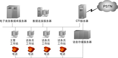 中型呼叫中心:座席代表在50~100之間。據(jù)專業(yè)數(shù)據(jù)統(tǒng)計公司預(yù)測,中型系統(tǒng)需求量最大,因此不少呼叫中心軟、硬件開發(fā)商對準這一目標進行開發(fā)。這種系統(tǒng)結(jié)構(gòu)相對簡單,投資也少,容易被中、小企業(yè)所接受。目前我國的一些公司開發(fā)系統(tǒng)多屬于此種類型。它可以省掉大型交換機的投資,而利用PBX與CTI服務(wù)器和業(yè)務(wù)代表座席直接相連,業(yè)務(wù)代表席同時與應(yīng)用服務(wù)器相連,客戶資料也存在應(yīng)用服務(wù)器中,可實時地將接入電話的客戶姓名自動在計算機屏幕上彈出。CTI服務(wù)器一般由CTI硬件開發(fā)商的板卡和PC組成,其擴容和增加功能也比較方便,成本也低,因此是一種投資小、見效快、升級也很靈活的系統(tǒng)。