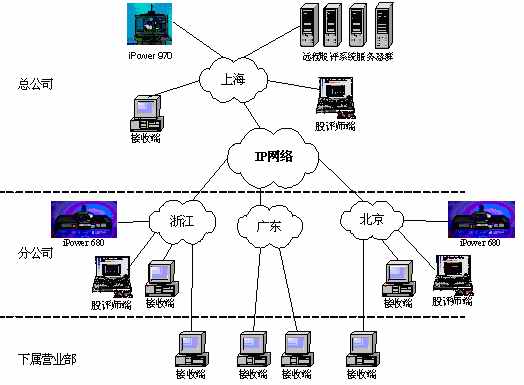 某證券公司有三級網(wǎng)絡(luò),總公司、分公司和下屬營業(yè)部?偣镜椒止編捠2M,在總公司配置一套會議室型電視會議終端POLYCOM 970和一套多點(diǎn)會議服務(wù)器Radvision ViaIP400。在分公司配置了38套會議室型電視會議終端POLYCOM 680,用于與總公司進(jìn)行雙向視頻會議。分公司到營業(yè)部帶寬是512K,各營業(yè)部安裝遠(yuǎn)程股評系統(tǒng)接收端程序,遠(yuǎn)程股評系統(tǒng)服務(wù)器都放置在海通總公司。當(dāng)在總公司進(jìn)行股評時(shí),總公司本地?cái)z像頭拍攝教師畫面,MIC采集教師聲音,傳給服務(wù)器編碼,再通過網(wǎng)絡(luò)供各個(gè)接收端接收;當(dāng)在分公司進(jìn)行股評時(shí),首先分公司的電視會議設(shè)備采集教師畫面及聲音傳回總公司的電視會議設(shè)備,再傳給遠(yuǎn)程股評系統(tǒng)的服務(wù)器進(jìn)行編碼,然后通過網(wǎng)絡(luò)發(fā)布,供接收端接收。(結(jié)構(gòu)如下圖)