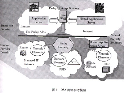為了克服傳統(tǒng)智能網(wǎng)的上述不足,開放業(yè)務(wù)體系結(jié)構(gòu)(OSA,Open Service Architecture)應(yīng)運而生。如圖5所示,OSA是一種全新的業(yè)務(wù)體系結(jié)構(gòu),主要包括底層通信網(wǎng)絡(luò),高層的應(yīng)用服務(wù)器(Application