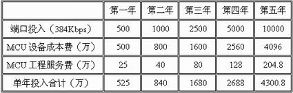 中國網(wǎng)通CNC視訊運(yùn)營網(wǎng)絡(luò)在建網(wǎng)成本上主要考慮四個部分。一是視訊交換平臺MCU部分,主要用于多點(diǎn)視頻通信;二是視訊運(yùn)營支撐系統(tǒng),包括各種運(yùn)營所必須的軟件(網(wǎng)管、業(yè)務(wù)受理中心、業(yè)務(wù)管理中心)及相應(yīng)的硬件服務(wù)器;三是 H.323 視訊系統(tǒng)的關(guān)鍵組件GK軟件及相應(yīng)硬件服務(wù)器,其容量和個人視頻通信業(yè)務(wù)的發(fā)展情況息息相關(guān);四是投入資金利息。具體可細(xì)分如下: