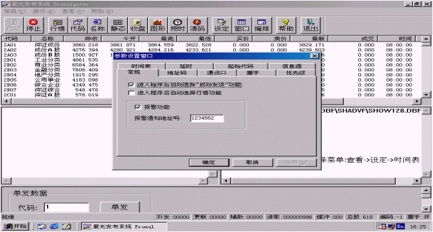 常規(guī)設(shè)置有可選擇<進入程序后自動選擇"啟動發(fā)送"功能>、<進入程序后自動選擇行情功能>、<報警功能>及報警通知地址碼的設(shè)置。啟動報警功能后,當信息源中斷時系統(tǒng)就會發(fā)出報警通知。