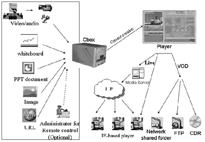 通過(guò)Cbox系統(tǒng),稅務(wù)局培訓(xùn)中心的講師只需預(yù)先將各種PowerPoint和圖片文件提供給Cbox,然后按照正常進(jìn)度進(jìn)行教學(xué)。Cbox可以自動(dòng)將攝像頭和麥克風(fēng)采集的講師的音視頻信號(hào)、白板信號(hào)、PowerPoint文檔前進(jìn)、后退、圖片和Internet資源URL進(jìn)行精確同步,制作出包含多種格式數(shù)據(jù)的數(shù)據(jù)流,然后以直播或點(diǎn)播的方式發(fā)布。用戶可以在自己的PC終端上通過(guò)IE瀏覽器同步觀看直播內(nèi)容,或者通過(guò)下載LAN共享目錄、FTP上的文件來(lái)觀看教學(xué)內(nèi)容。如果沒(méi)有網(wǎng)絡(luò)環(huán)境,還可以通過(guò)刻錄光盤后分發(fā)將培訓(xùn)內(nèi)容傳遞。而且因?yàn)橹恍鑇indows媒體播放機(jī)和IE瀏覽器就可正常播放,所以可以降低客戶端軟件安裝調(diào)試的工作量和費(fèi)用。系統(tǒng)中還有可供選擇的助教,他只需使用普通PC和IE瀏覽器,在講師不方便控制PowerPoint文檔等內(nèi)容的情況下,幫助講師完成相應(yīng)操作。另外一個(gè)可選的流媒體服務(wù)器,是用來(lái)支持大量用戶同時(shí)直播、點(diǎn)播需求。