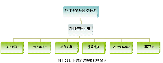 。。4.2 成立共同的項(xiàng)目小組,盡可能分模塊負(fù)責(zé)。需求方一個(gè)項(xiàng)目小組,開發(fā)方一個(gè)項(xiàng)目小組,雙方派出項(xiàng)目經(jīng)理的方式往往不能滿足Call Center這樣復(fù)雜的系統(tǒng)需要。建議雙方建立共同的項(xiàng)目小組,充分溝通與合作,控制項(xiàng)目的范圍和質(zhì)量。圖6 是項(xiàng)目小組的建議。