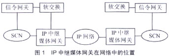 IP中繼媒體網(wǎng)關(guān)在IP網(wǎng)絡(luò)和電路交換網(wǎng)絡(luò)(SCN)之間提供媒體映射和代碼轉(zhuǎn)換功能,即終止電路交換網(wǎng)絡(luò)設(shè)施(中繼線路),將媒體流分組化并在IP網(wǎng)絡(luò)上傳輸,在IP網(wǎng)絡(luò)去往SCN的方向也執(zhí)行類(lèi)似的功能。IP中繼媒體網(wǎng)關(guān)在網(wǎng)絡(luò)中的位置如圖1所示。
