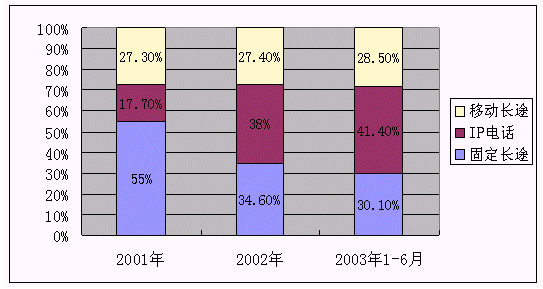 從圖上看,移動長途占整個長途通話比重增長緩慢,IP長途所占比重上升較快,已由2001、2002年的17.7%、38%上升到41.4%,與此相反,傳統(tǒng)固定長途所占比重下降較快,由2001年占整個長途通話的55%,迅速下降到目前的30.1%。隨著移動長途、IP長話的異質(zhì)競爭加劇,大量分流了傳統(tǒng)固定長途,2003年1-6月傳統(tǒng)固定長途中國內(nèi)長途、國際及港澳臺通話時長比上年同期分別下降0.6%、6.4%、13.9%。