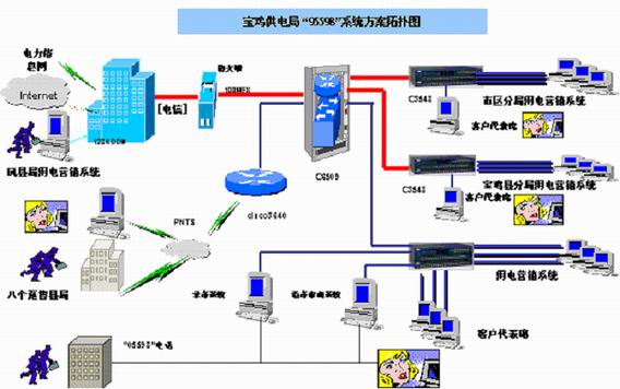 、 利用現(xiàn)有的計(jì)算機(jī)網(wǎng)絡(luò)基礎(chǔ)實(shí)現(xiàn)市區(qū)供電分局、寶雞縣供電分局、鳳縣供電分局三個(gè)供電分局與局客戶(hù)服務(wù)中心的信息聯(lián)結(jié);