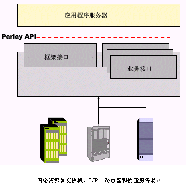 Parlay/OSA設(shè)想應(yīng)用程序運(yùn)行在應(yīng)用服務(wù)器上,通過(guò)TCP/IP連到Parlay/OSA網(wǎng)關(guān)。