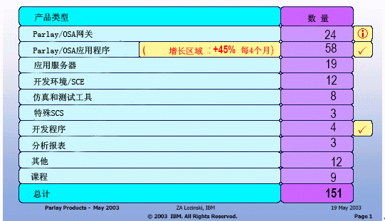 2003年5月底,世界上已經(jīng)有45個(gè)業(yè)務(wù)提供商正在使用Parlay 3.0或正準(zhǔn)備采用Parlay技術(shù)。