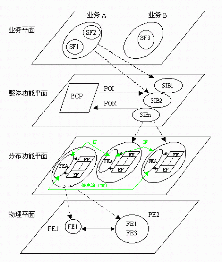 在上圖1中, SF—業(yè)務(wù)屬性;BCP—基本呼叫處理;SIB—業(yè)務(wù)無(wú)關(guān)構(gòu)筑塊;FE—功能實(shí)體; FEA—功能實(shí)體動(dòng)作;FE—物理實(shí)體;POI—起始點(diǎn);