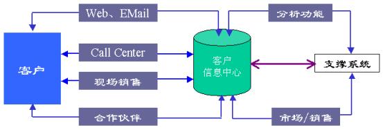 CRM系統(tǒng)的實(shí)施與企業(yè)的內(nèi)部和外部系統(tǒng)緊密相關(guān)。其涉及市場、營銷、銷售、實(shí)施、客戶服務(wù)與支持等一系列循環(huán)過程。一個(gè)完整的CRM系統(tǒng)不僅包含與客戶的多方位的多渠道接觸外,還包含市場的定位和分割,營銷策略的制定和客戶細(xì)分,銷售機(jī)會(huì)的把握,銷售的執(zhí)行(任務(wù)分派,任務(wù)的跟蹤),客戶的管理與分析,客戶的反饋與策略的評(píng)判等。從而再重新修正市場策略。這樣一個(gè)循環(huán)過程涉及管理、市場、客戶、產(chǎn)品、數(shù)據(jù)分析與處理等多學(xué)科的知識(shí)與技術(shù)。