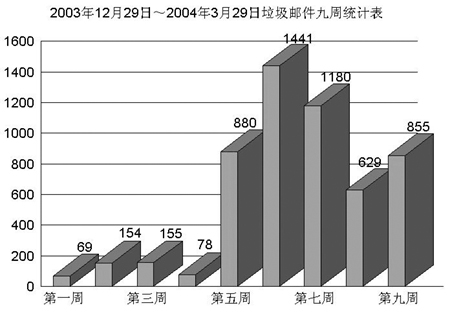 出于為反垃圾郵件產(chǎn)品評測積累樣本的目的,記者于2003年12月在“計算機世界網(wǎng)”上張貼了一個誘餌信箱,令人吃驚的是,僅僅在誘餌信箱發(fā)布后不到5分鐘,第一封垃圾郵件就不期而至。自從該誘餌信箱發(fā)布以來,其垃圾郵件的數(shù)量增長情況如上圖所示。