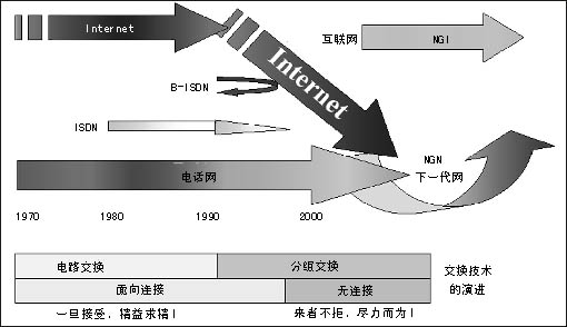 傳統(tǒng)電信網和互聯網都面臨著挑戰(zhàn),基于電話業(yè)務設計的電路交換網不能靈活適應帶寬各異的數據業(yè)務的發(fā)展。專為數據業(yè)務設計的互聯網則存在著安全性、可管理性、商業(yè)模式等問題的困擾。NGI對目前電信網的主要盈利業(yè)務語音的質量保證以及對電信網增長空間很大的業(yè)務(移動)關注不夠。NGI可能達到的目標不能滿足電信界的需要。因此,在NGI之后ITU和ETSI等提出了更高的目標——NGN,這就是NGN的提出背景。信息產業(yè)部電信研究院科技委副主任委員雷震洲認為,兩大亮點點燃了NGN:一是數據超過語音的信息需求,全球互聯網用戶目前已逾7億,全世界在網上傳送的以IP為代表的數據業(yè)務量已經超過語音業(yè)務量;二是移動超過固定的個性化需求,全球移動用戶已經超過13億,近100個國家的移動用戶數已經超過固定用戶數,我國在2003年10月移動用戶也超過了固定用戶數。