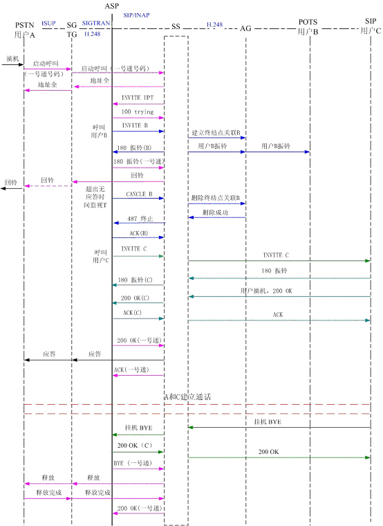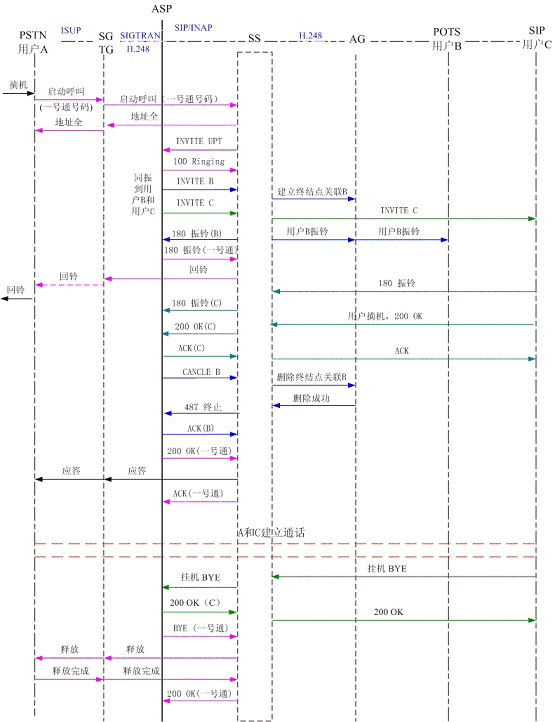 圖4為PSTN用戶A撥打一號通用戶,同振到軟交換域AG下POTS用戶B和SIP用戶C,其中軟交換和應用服務器以SIP協(xié)議相連,軟交換和AG、軟交換和TG以H.248協(xié)議相連?梢钥吹,用戶B和用戶C同時振鈴,用戶C摘機應答,應用服務器取消了對用戶B的振鈴。雙方通話,通話結束,用戶C掛機,系統(tǒng)釋放了連接。
