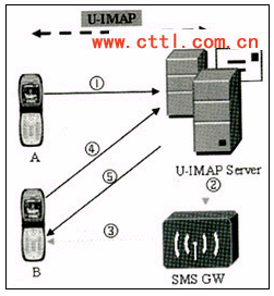 1)多媒體郵件由移動(dòng)手機(jī)終端A發(fā)送到服務(wù)器UIMAP Server;