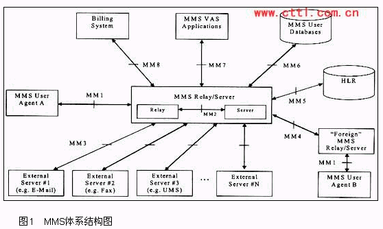重復(fù)使用的原有網(wǎng)元有HLR,它通過(guò)MM5接口向MMSC提供用戶簽約信息。圖1列出了目前MMS系統(tǒng)中常用的接口是MMI-MM8。這些接口遵循相應(yīng)的接口規(guī)范。