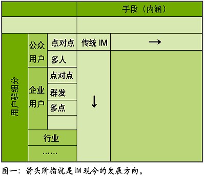 IT行業(yè)發(fā)展數(shù)十年,有一個(gè)共識(shí),或是一種經(jīng)驗(yàn)結(jié)論,大約是:在用“老工具解決新問題”、“老工具解決老問題”、“新工具解決老問題”、“新工具解決新問題”四者中,一般最先者最善,也極討巧,最后者則最為事倍功半。觀IM發(fā)展趨勢(shì),似乎介于“新工具解決老問題”、“新工具解決新問題”二者之間,就體現(xiàn)在表中兩個(gè)箭頭上,是以錢景堪憂。