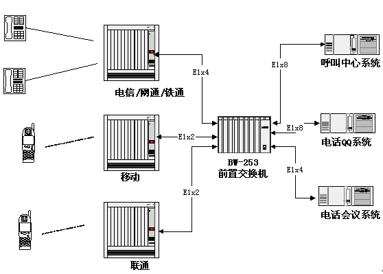 - 能與多個運營商的交換機(jī)連接,將呼叫分配到后端的多種語音業(yè)務(wù)系統(tǒng)。